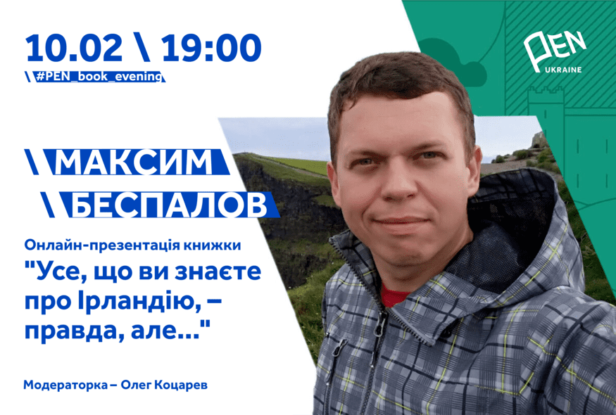 У рамках проєкту "Книжкових вечорів із PEN Ukraine" (#PEN_book_evening) 10 лютого о 19:00 відбудеться презентація нової книжки Максима Беспалова "Усе, що ви знаєте про Ірландію, — правда, але..." (Віхола)