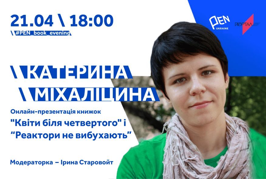 У рамках проєкту "Книжкових вечорів із PEN Ukraine" (#PEN_book_evening) 21 квітня о 18:00 відбудеться онлайн-презентація книжок Катерини Міхаліциної "Квіти біля четвертого" і "Реактори не вибухають" (Портал).