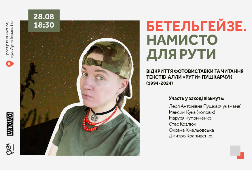 28 серпня (середа) о 18:30 у просторі PEN Ukraine відбудеться відкриття фотовиставки Алли "Рути" Пушкарчук (1994-2024) "Бетельгейзе. Намисто для Рути".