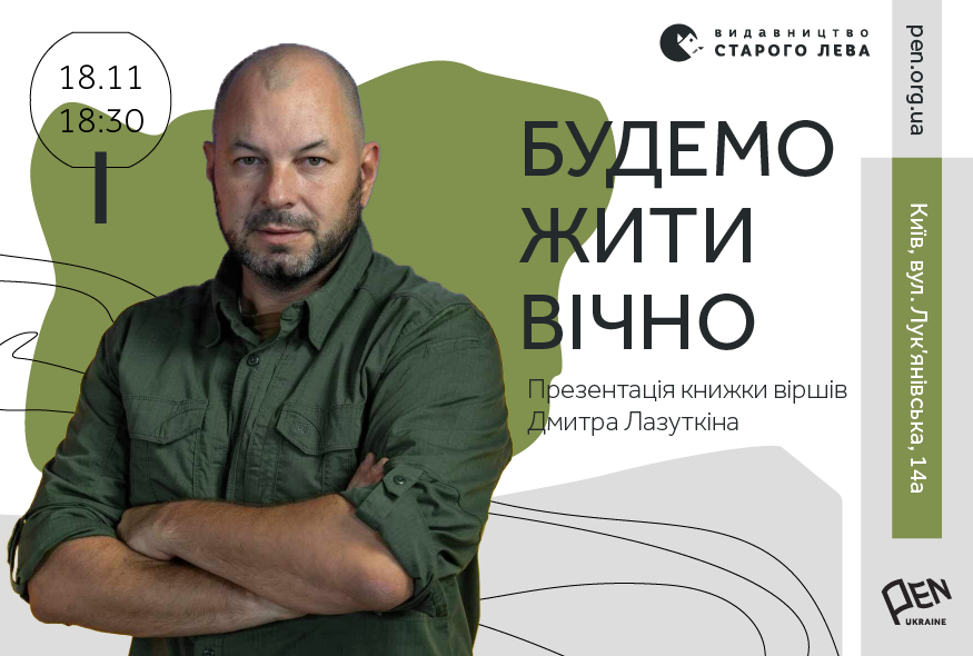 18 листопада о 18:30 у просторі PEN Ukraine відбудеться презентація книжки віршів поета, журналіста й військового Дмитра Лазуткіна "Будемо жити вічно". Подія приуорочена до Дня народження автора.