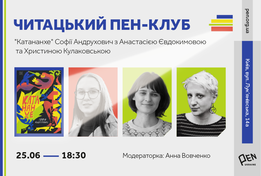 25 червня о 18:30 у просторі PEN Ukraine відбудеться п’ята зустріч другого сезону Читацького ПЕН-клубу, впродовж якої літературознавиця й головна редакторка Сенсор Медіа Анастасія Євдокимова говоритиме про роман Софії Андрухович "Катананхе" з фотографкою та засновницею порталу "Жителі Києва" Христиною Кулаковською. Захід модеруватиме Анна Вовченко, менеджерка проєктів Українського ПЕН та кураторка Читацького ПЕН-клубу.