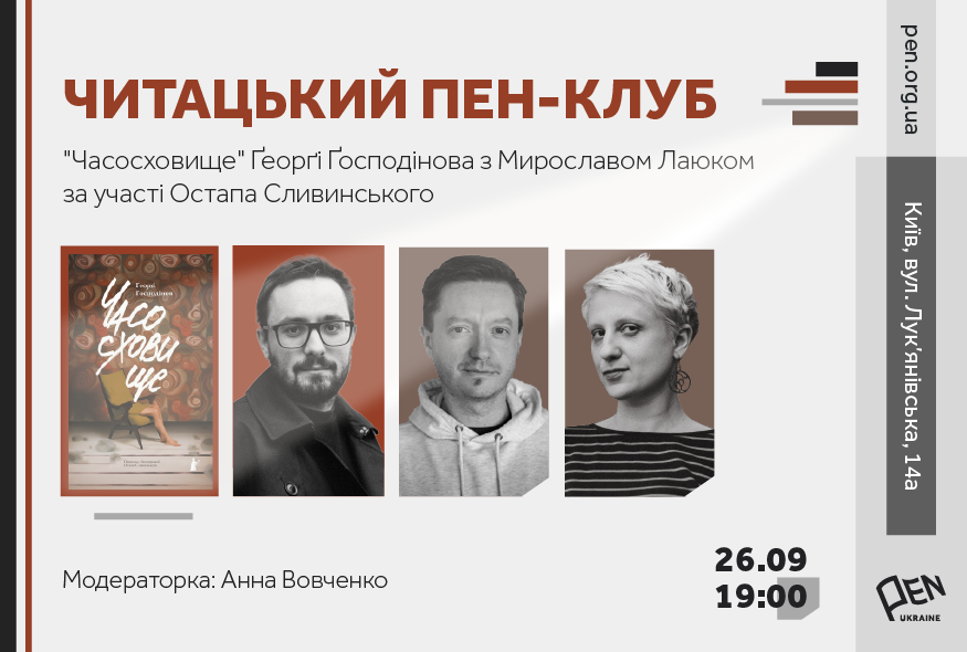 26 вересня о 19:00 у просторі PEN Ukraine відбудеться сьома зустріч Читацького ПЕН-клубу, впродовж якої письменник Мирослав Лаюк говоритиме про роман Ґеорґі Ґосподінова "Часосховище" із поетом і перекладачем Остапом Сливинським. Захід модеруватиме Анна Вовченко.