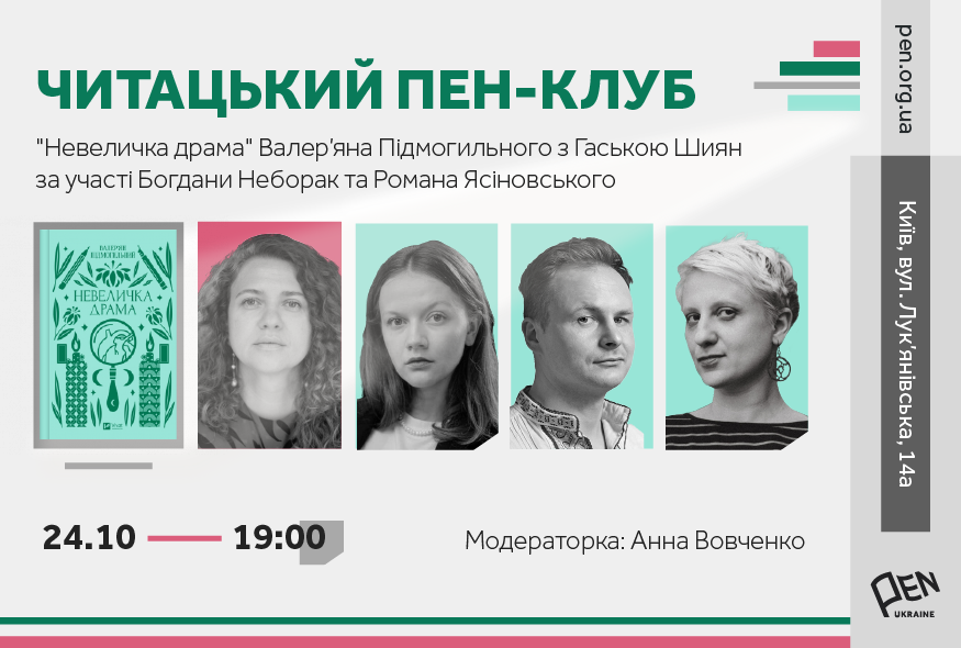 24 жовтня о 19:00 у просторі PEN Ukraine відбудеться восьма зустріч Читацького ПЕН-клубу, впродовж якої письменниця та перекладачка Гаська Шиян говоритиме про роман Валер’яна Підмогильного "Невеличка драма" з журналісткою, культурною менеджеркою Богданою Неборак та актором Романом Ясіновським. Захід модеруватиме Анна Вовченко.