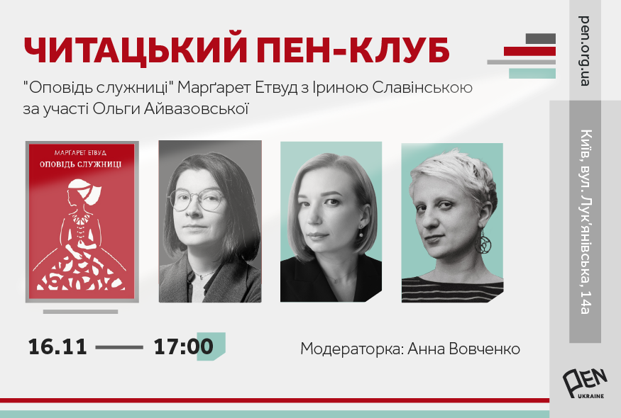 16 листопада о 17:00 у просторі PEN Ukraine відбудеться дев’ята зустріч Читацького ПЕН-клубу, впродовж якої письменниця, радіоведуча та продюсерка, перекладачка Ірина Славінська говоритиме про роман Марґарет Етвуд "Оповідь служниці" з громадською діячкою Ольгою Айвазовською. Захід модеруватиме Анна Вовченко.