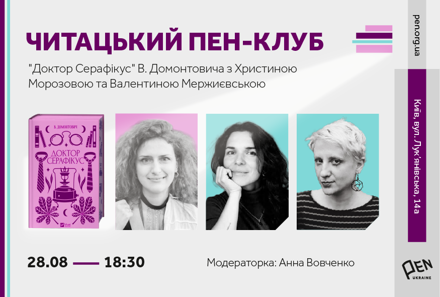 28 серпня о 18:30 у просторі PEN Ukraine відбудеться шоста зустріч другого сезону Читацького ПЕН-клубу, впродовж якої письменниця та комунікаційниця Христина Морозова говоритиме про роман В. Домонтовича "Доктор Серафікус" із Валентиною Мержиєвською – освітянкою та подкастеркою. Захід модеруватиме Анна Вовченко.