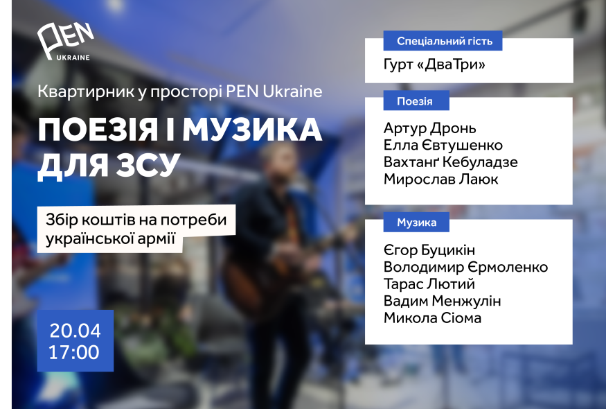 20 квітня (субота) о 17:00 відбудеться дев’ятий камерний поетично-музичний квартирник у просторі PEN Ukraine.
