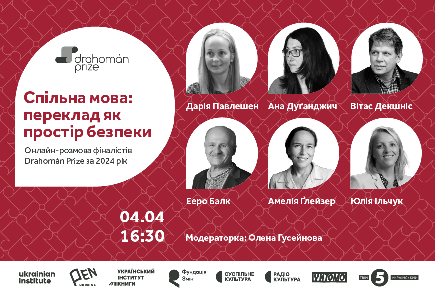 4 квітня о 16:30 відбудеться онлайн-розмова фіналістів премії Drahomán Prize за 2024 рік – Ееро Балк, Амелія Ґлейзер, Юлія Ільчук, Дарія Павлешен, Ана Дуґанджич, а також володар Спеціальної відзнаки Капітули премії Вітас Декшніс. Модеруватиме зустріч письменниця, журналістка і радіоведуча Олена Гусейнова.