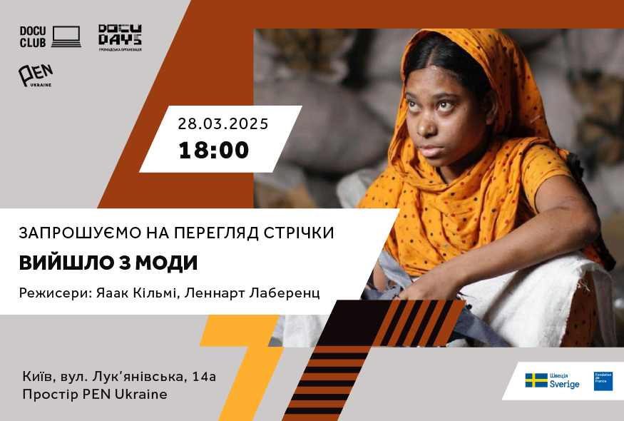 28 березня (п’ятниця) о 18:00 у просторі PEN Ukraine в рамках Кіноклубу Docudays UA при Українському ПЕН відбудеться показ документальної стрічки "Вийшло з моди"