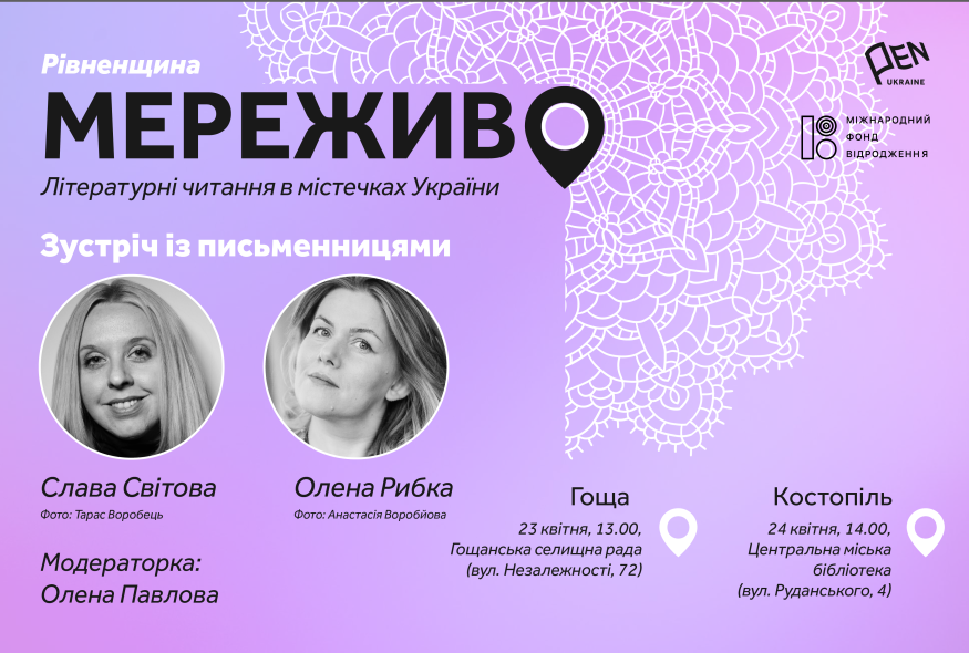 23-24 квітня в рамках проєкту Українського ПЕН "Мереживо. Літературні читання в містечках України" в Гощі й Костополі, що на Рівненщині, поспілкуються з читачами письменниці Олена Рибка (Харків) і Слава Світова (Київ). Модераторка заходів – Олена Павлова (Рівне - Київ). Проєкт реалізується за підтримки Міжнародного фонду "Відродження".