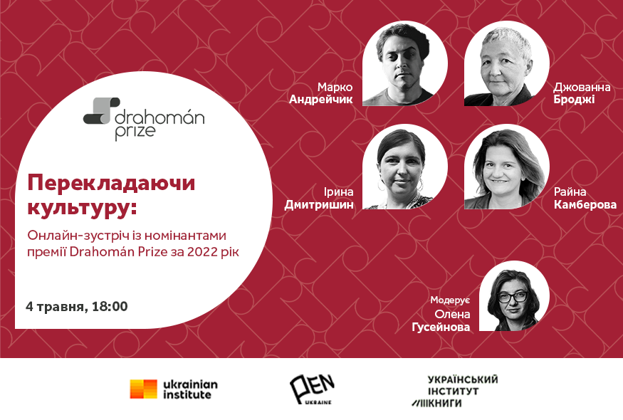 4 травня о 18:00 відбудеться онлайн-зустріч із номінантами Drahomán Prize за 2022 рік – фіналістами Премії Марком Андрейчиком, Іриною Дмитришин і Райною Камберовою, а також володаркою Спеціальної відзнаки Капітули премії Джованною Броджі. Модеруватиме зустріч письменниця, журналістка і радіоведуча Олена Гусейнова.