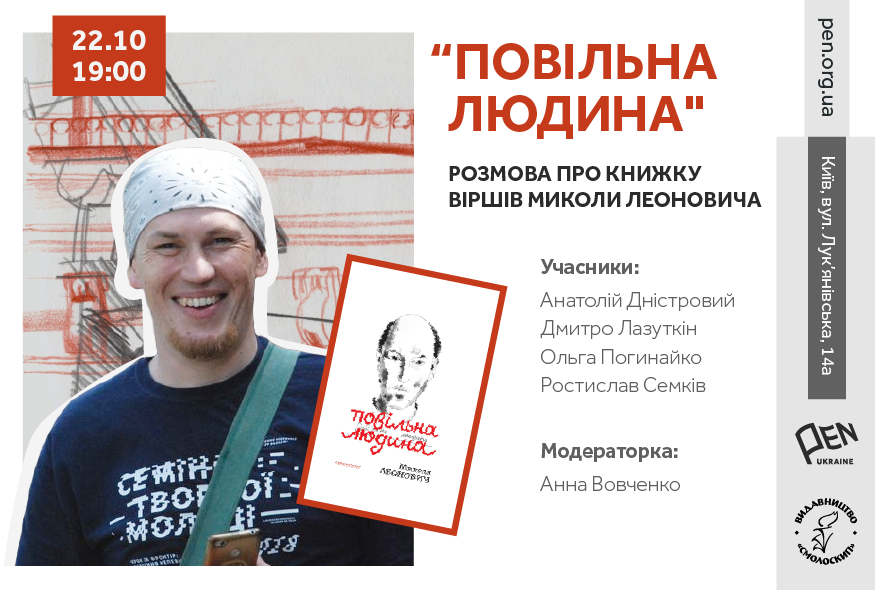 22 жовтня о 19:00 відбудеться літературний вечір, присвячений виходу книжки поезій Миколи Леоновича "Повільна людина". Микола Леонович — поет, книжковий дизайнер та ілюстратор, лауреат літературного конкурсу видавництва "Смолоскип" 2003 року, військовослужбовець. Книжка віршів та ілюстрацій "Повільна людина" включає поезії зі збірки "Агон" (2004), невиданої збірки "Read My Lips (Повтори це за мною)" (2006–2007) і новіші тексти до 2022 року.