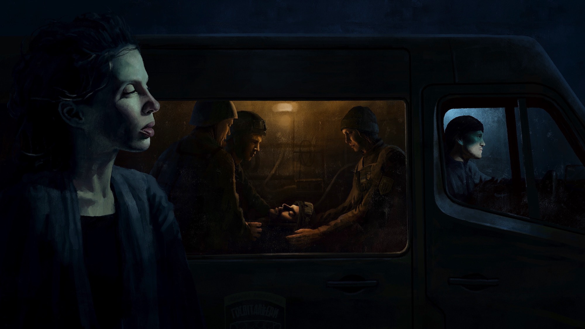— Кейсевака. Автомобіля для евакуації поранених. Прямо на фанері їхала. А вона в бруді, солярі і крові. І я там, як кіт, вмістилася межи каністр із солярою і оцим-от усім прекрасним такмедом. І проспала всю дорогу. То десь так би зараз все й намалювала.
