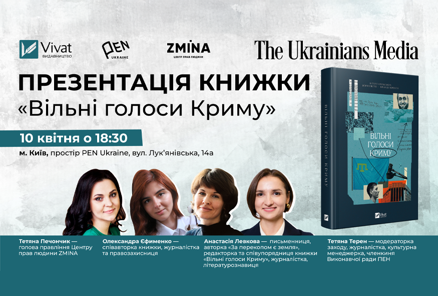 10 квітня 2025 року у просторі PEN Ukraine відбудеться презентація книжки "Вільні голоси Криму" — унікального видання, що розповідає історії кримських бранців Кремля. Це спільна ініціатива Українського ПЕН, The Ukrainians Media, видавництва Vivat і Центру прав людини ZMINA за підтримки Національного фонду на підтримку демократії (NED).
