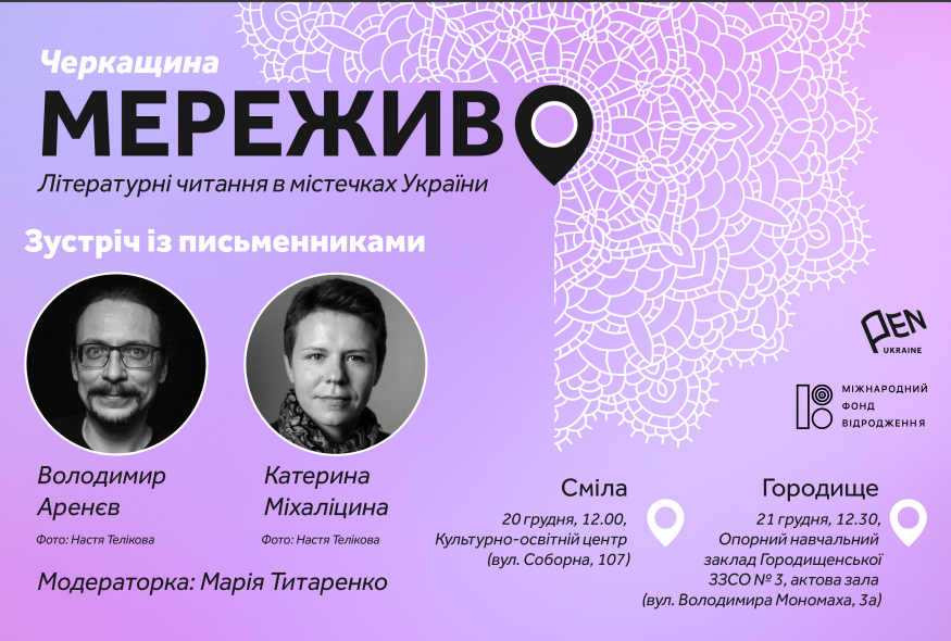 20-21 грудня у рамках проєкту Українського ПЕН "Мереживо. Літературні читання в містечках України" в містах Сміла та Городище, що на Черкащині, поспілкуються з читачами письменники Володимир Аренєв (Київ) і Катерина Міхаліцина (Львів). Модераторка заходів – Марія Титаренко (Львів). Проєкт реалізується за підтримки Міжнародного фонду "Відродження".