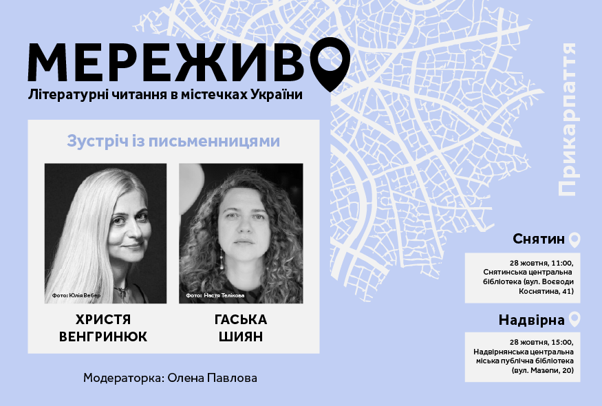 28 жовтня у рамках проєкту Українського ПЕН "Мереживо. Літературні читання в містечках України" в містах Снятин і Надвірна на Прикарпатті поспілкуються з читачами авторки Христя Венгринюк (Чернівці – Софія) та Гаська Шиян (Львів). Модераторка заходів – Олена Павлова (Рівне – Київ – Львів). Проєкт реалізується за підтримки Міжнародного фонду "Відродження".