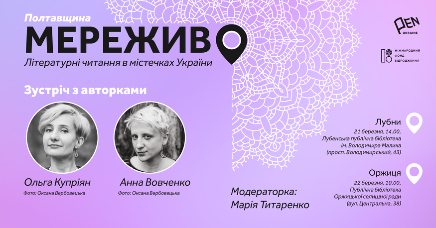 21-22 березня у рамках проєкту Українського ПЕН "Мереживо. Літературні читання в містечках України" в містах Лубни та смт Оржиця, що на Полтавщині, поспілкуються з читачами письменниці Ольга Купріян (Київ) і Анна Вовченко (Київ). Модераторка заходів – Марія Титаренко (Львів). Проєкт реалізується за підтримки Міжнародного фонду "Відродження".
