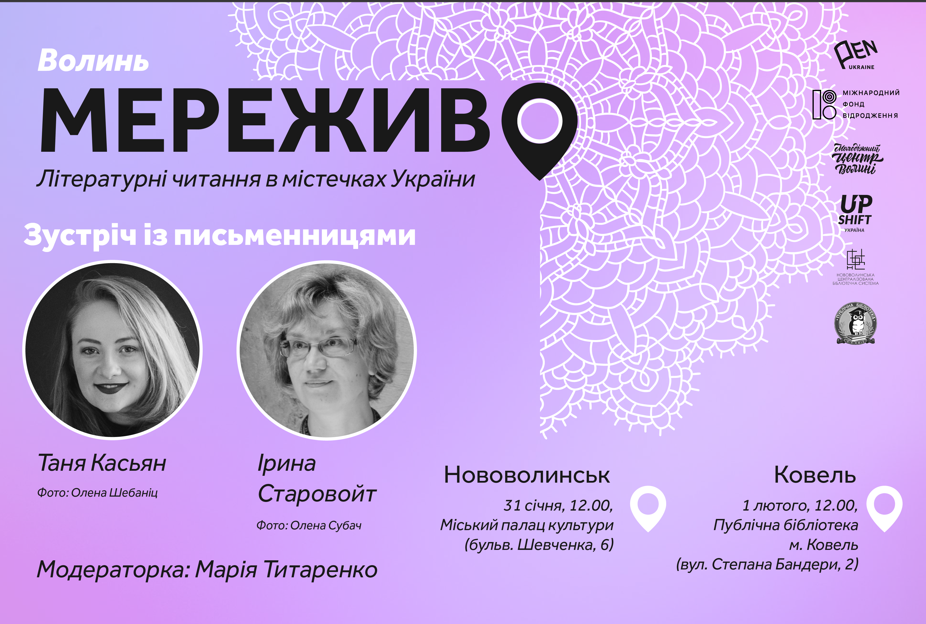 31 січня – 1 лютого в рамках проєкту Українського ПЕН "Мереживо. Літературні читання в містечках України" в містах Нововолинськ та Ковель, що на Волині, поспілкуються з читачами письменниці Ірина Старовойт (Львів) і Таня Касьян (Маріуполь – Київ). Модераторка заходів – Марія Титаренко (Львів). Проєкт реалізується за підтримки Міжнародного фонду "Відродження".