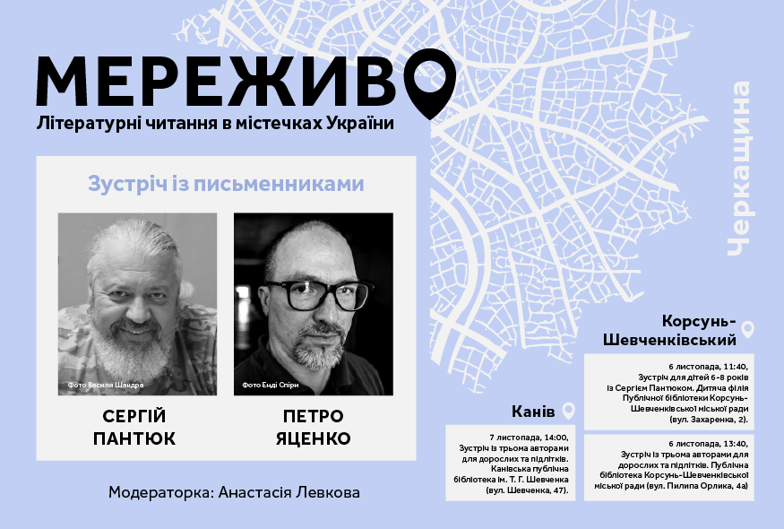 6-7 листопада у рамках проєкту Українського ПЕН "Мереживо. Літературні читання в містечках України" в містах Корсунь-Шевченківський та Канів на Черкащині поспілкуються з читачами письменники Сергій Пантюк і Петро Яценко. Модераторка заходів – Анастасія Левкова. Проєкт реалізується за підтримки Міжнародного фонду "Відродження".