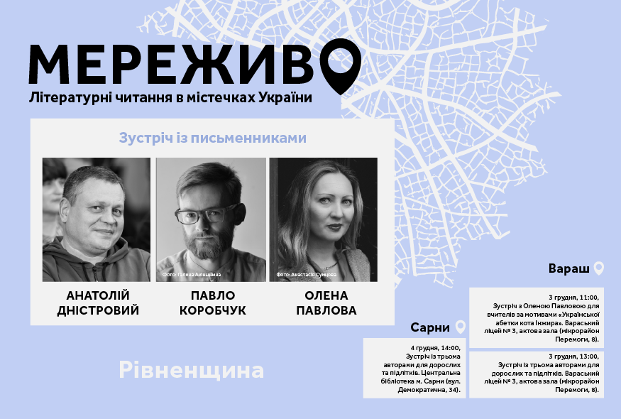 3-4 грудня у рамках проєкту Українського ПЕН "Мереживо. Літературні читання в містечках України" в містах Вараш і Сарни на Рівненщині поспілкуються з читачами автори Анатолій Дністровий та Павло Коробчук. Модераторка заходів – Олена Павлова. Проєкт реалізується за підтримки Міжнародного фонду "Відродження".