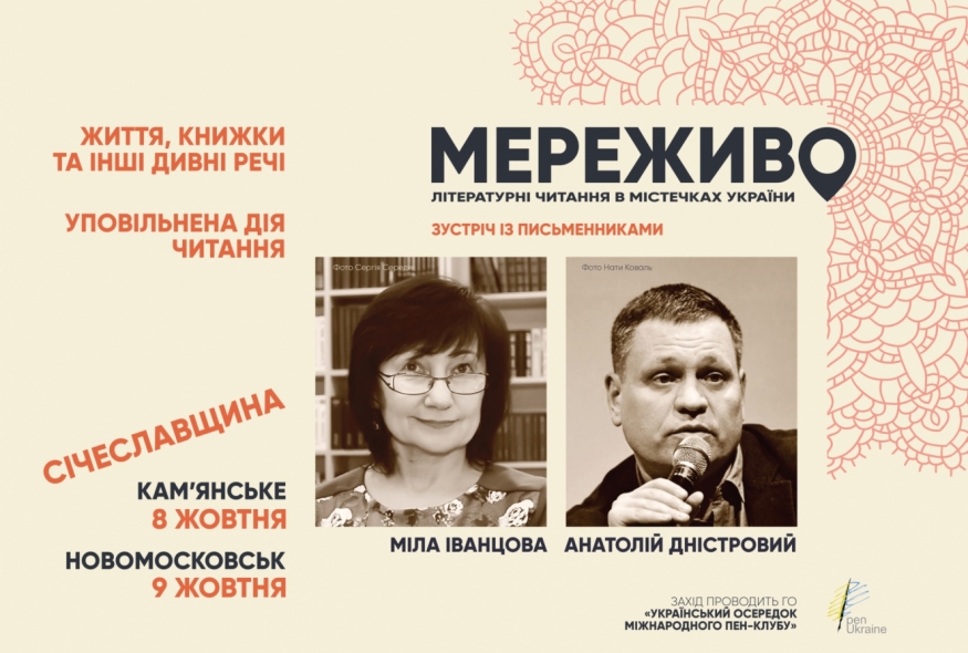 8-9 жовтня, у рамках проєкту "Мереживо. Літературні читання у містечках України", який проводить Український ПЕН, українські письменники Анатолій Дністровий та Міла Іванцова поспілкуються з читачами у містах Кам’янське та Новомосковськ Січеславської області.