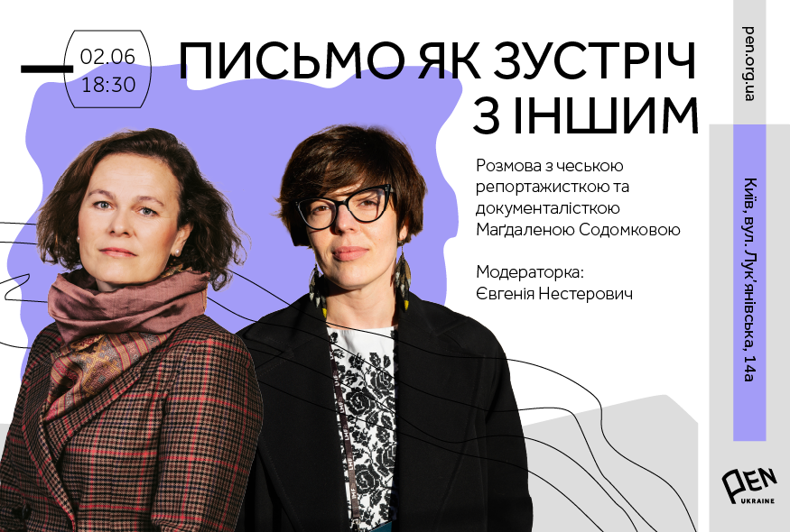 2 червня (понеділок) о 18:30 у просторі PEN Ukraine відбудеться розмова з чеською репортажисткою та документалісткою Маґдаленою Содомковою: письмо як зустріч з Іншим.
