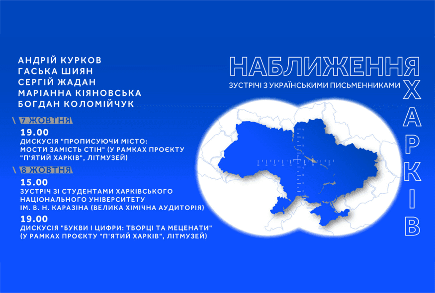 7 та 8 жовтня у рамках проєкту "Наближення" в Харкові відбудуться три заходи за участі членів та членкинь Українського ПЕН Андрія Куркова, Гаськи Шиян, Сергія Жадана, Маріанни Кіяновської та Богдана Коломійчука.