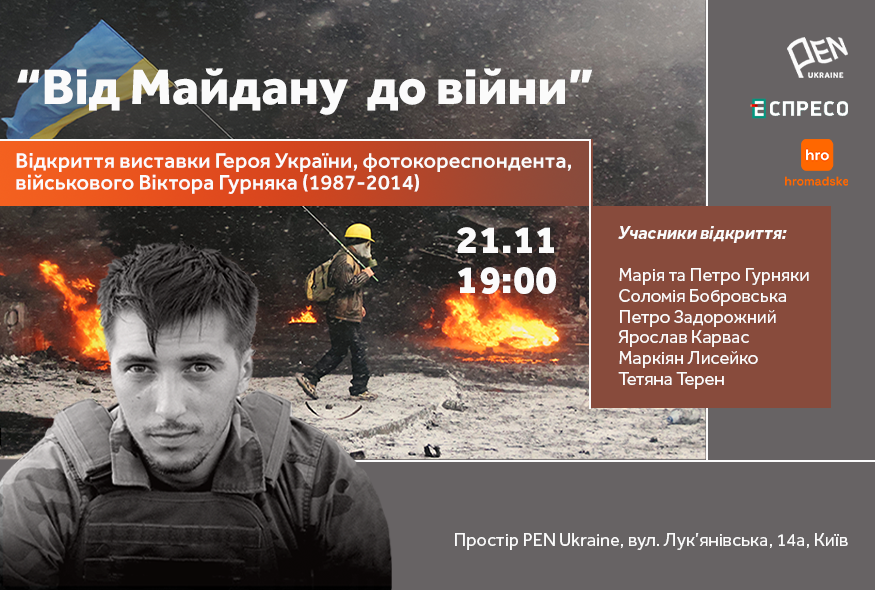 21 листопада о 19:00 у просторі PEN Ukraine відбудеться відкриття виставки "Від Майдану до війни" загиблого фотографа та військового Віктора Гурняка. Захід пройде в день десятої річниці Революції Гідності.