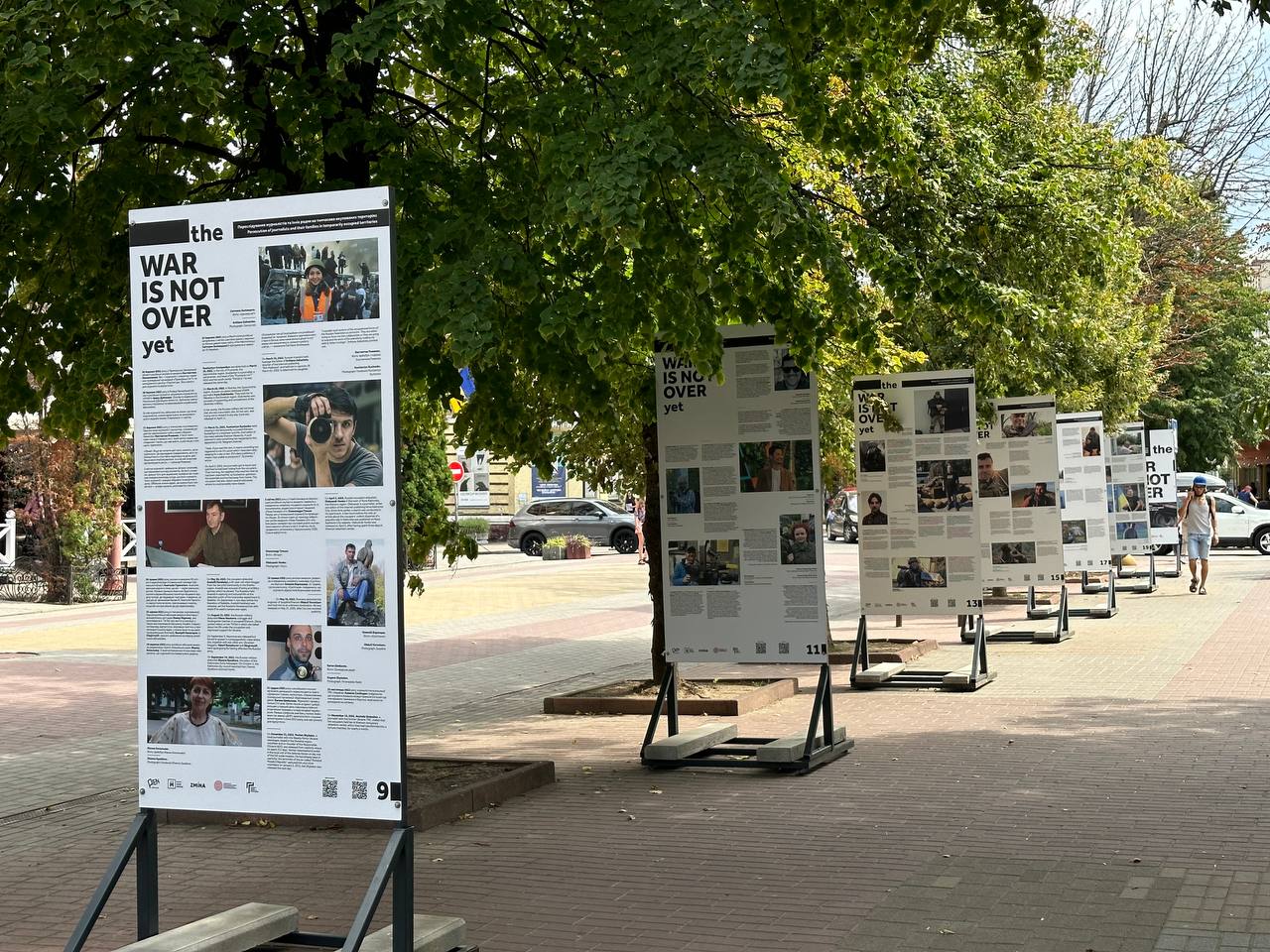 На стендах вуличної виставки The War Is Not Over Yet зібрано історії та світлини журналістів, операторів, фотографів, фіксерів, які загинули, були поранені або опинилися у полоні з 24 лютого 2022 року.