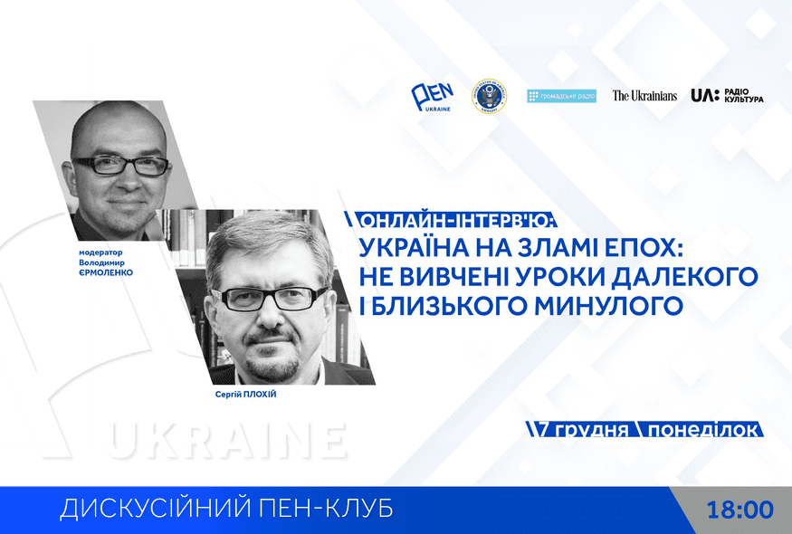 7 грудня о 18:00 відбудеться онлайн-інтерв’ю з Сергієм Плохієм - професором історії України Гарвардського університету, директором Українського наукового інституту, автором книг "Брама Європи", "Убивство в Мюнхені" та інших. Розмову вестиме Володимир Єрмоленко - філософ, письменник, журналіст, директор з аналітики Інтерньюз-Україна, головний редактор UkraineWorld.org. Тема: "Україна на зламі епох: Невивчені уроки далекого і близького минулого".