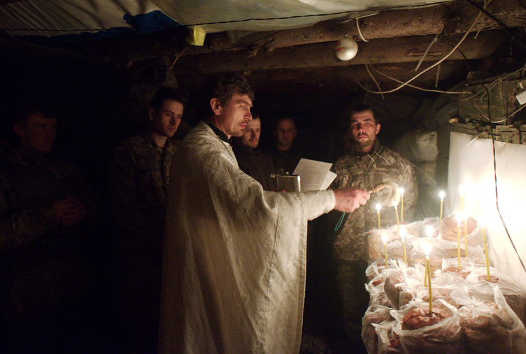 "Час починати. Паски розставлені на імпровізованому столику із ящиків з-під набоїв. У бліндажі повно людей. Бійці впевнено відстояли всю літургію, уважно прислухаючись до слів священників. Далеко не всі з них глибоко віруючі".