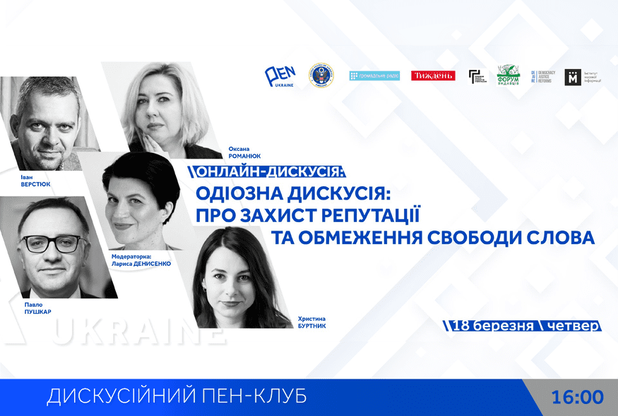 18 березня о 19:00 у межах Дискусійного ПЕН-клубу відбудеться розмова "Одіозна дискусія: Про захист репутації та обмеження свободи слова".